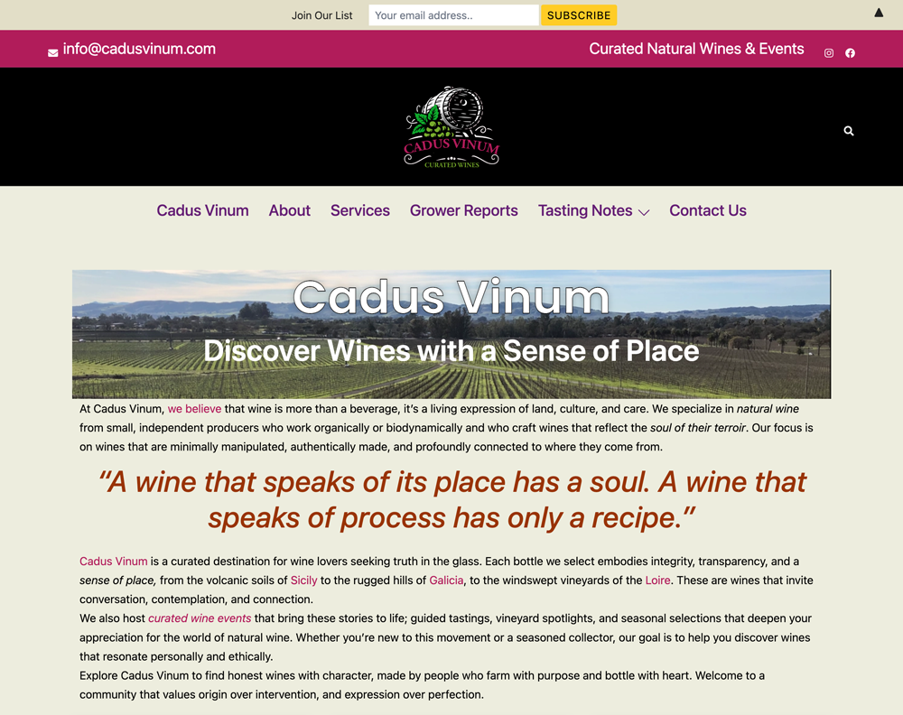 Cadus Vinum presents itself as a refined, intellectually grounded wine platform that operates at the intersection of curation, education, and experience. From a marketing standpoint, it is less a traditional retailer and more a taste making authority, built on the premise that wine should be understood as an expression of place, culture, and process rather than simply consumed.